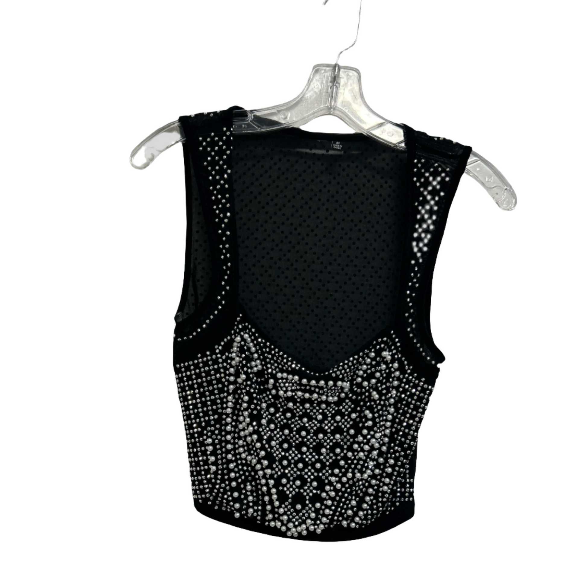 93% polyester 7% spandex. Black crop top with rhinestones and pearls.