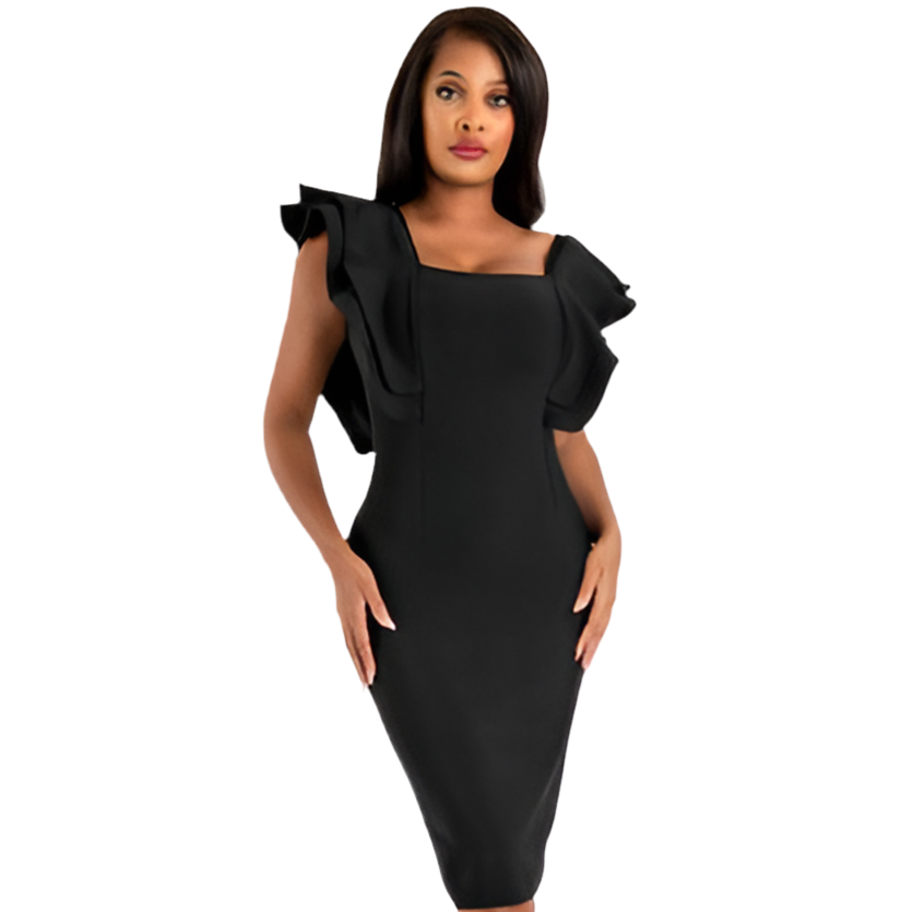 Ruffle Trim Zip Back Bandage Dress. 85% Polyester 15% Spandex