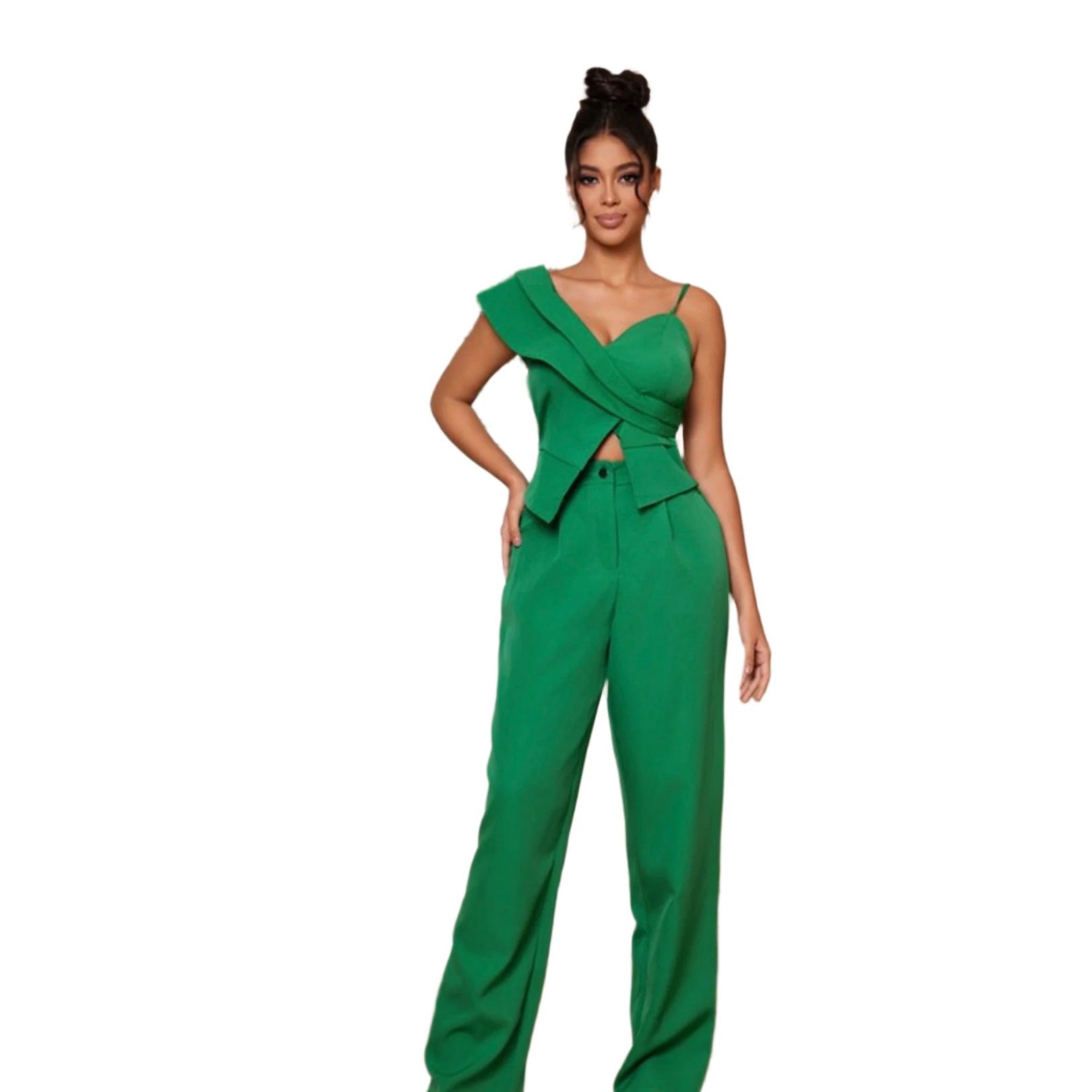 Solid color, matching pants set, with one shoulder ruffle top, adjustable straps, straight leg bottoms. 95% polyester, 5% spandex.