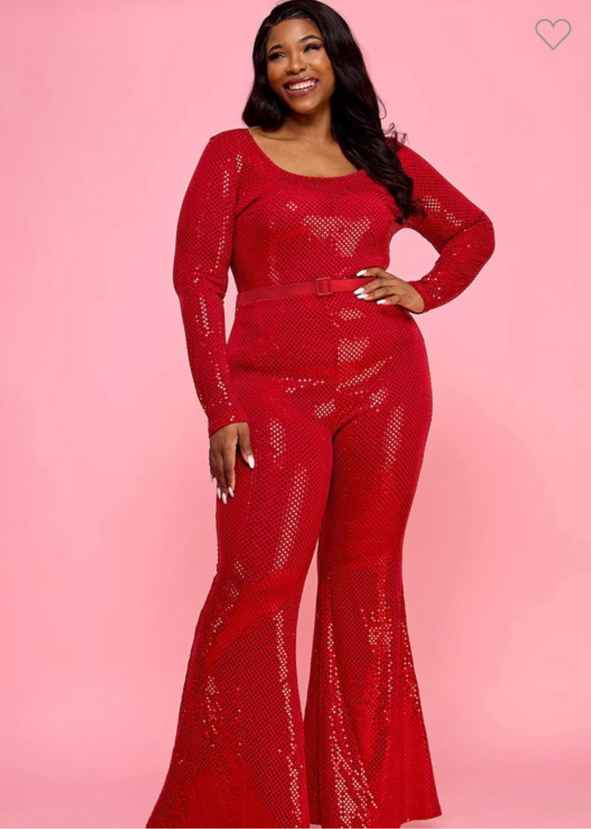 Metal sequin flare leg jumpsuit with belt, deep neck, long sleeve, with skinny belt 85% polyester 10% lurex 5% spandex