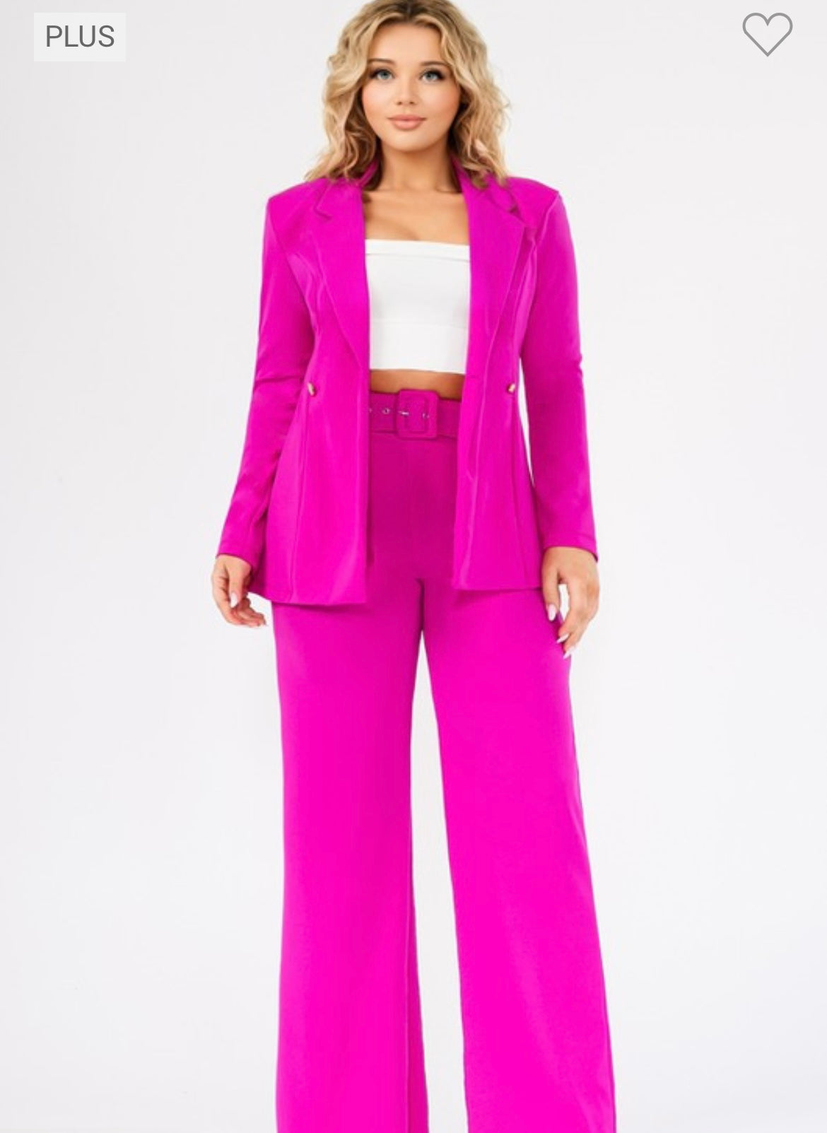 Two piece set with blazer and pants, belt it, one button, front, patty, shoulder, wide leg, and stretch material. 95% polyester 5% spandex