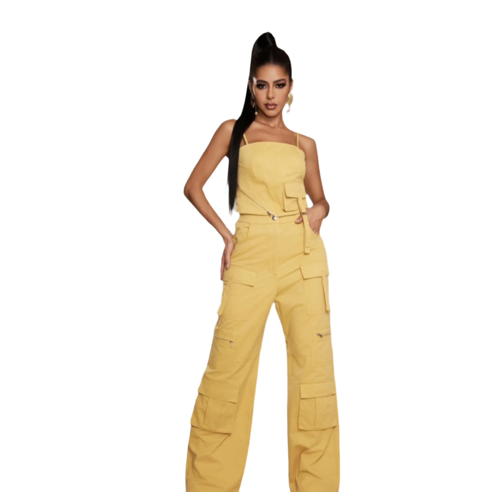 Solid color matching pants set, with adjustable straps, zipper detail on the side and a small pocket. With straight leg bottoms with multi pockets.