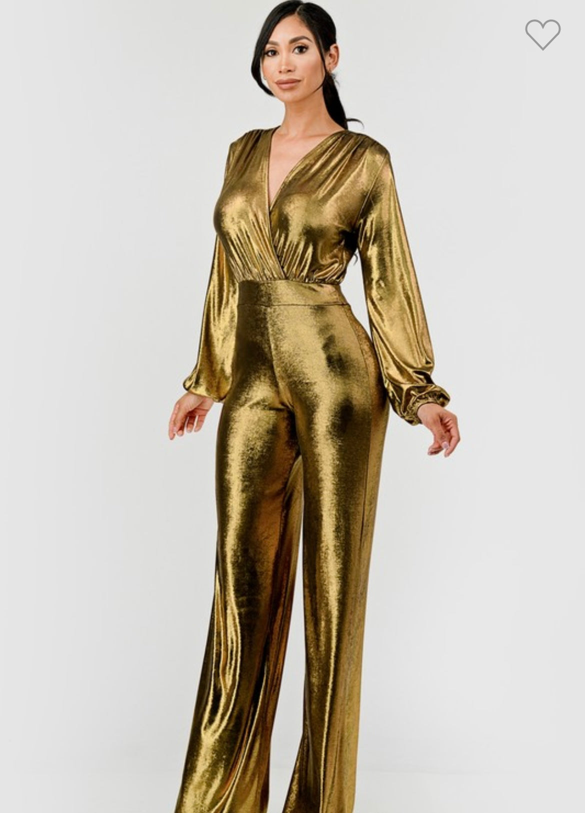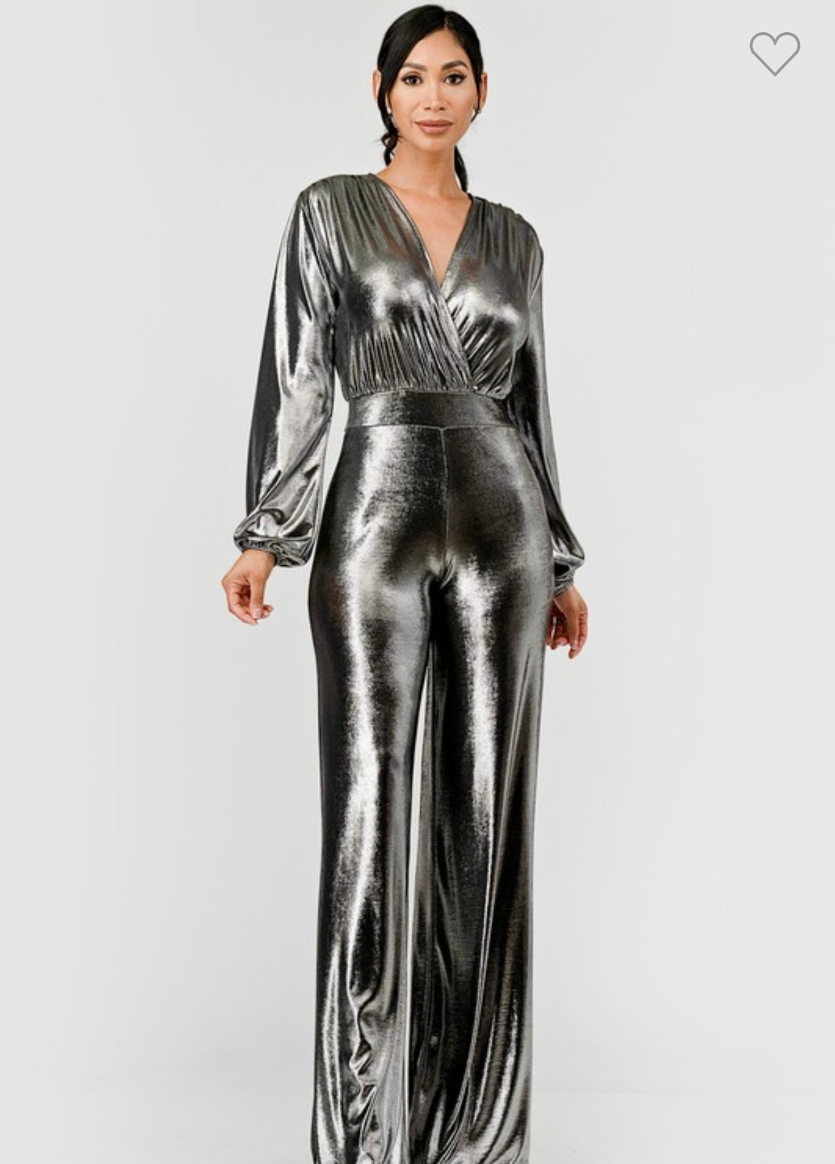 Long sleeve Metallic Wide leg jumpsuit. 95% polyester 5% spandex . Very good stretch