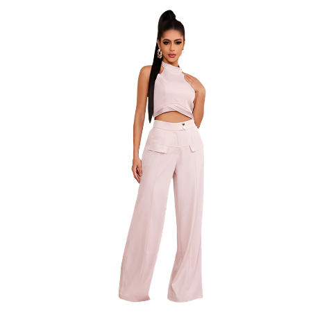 Solid color crop top with halter top. Straight leg bottoms with pockets on the side. Fitted top and bottom. Double button closures on the bottoms.