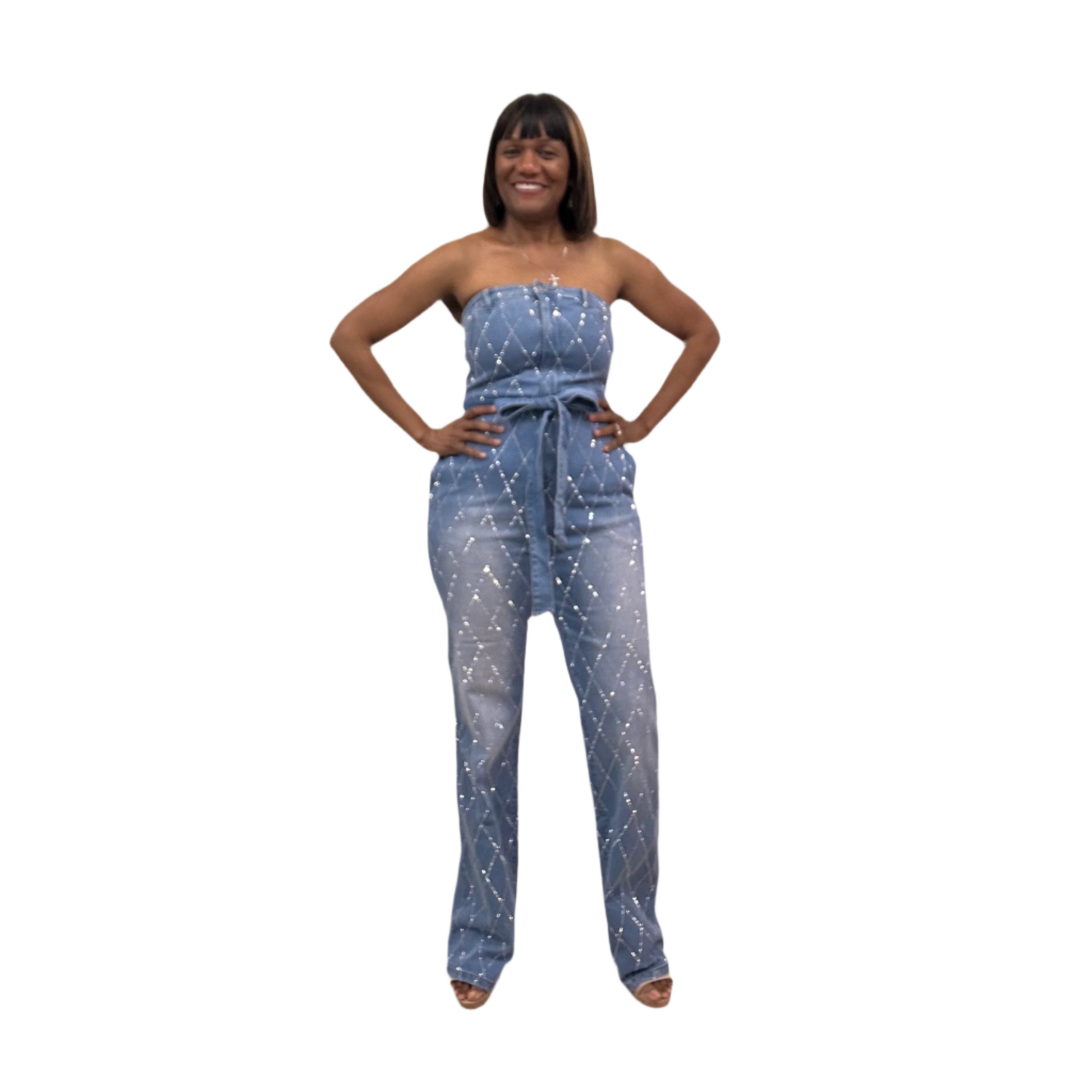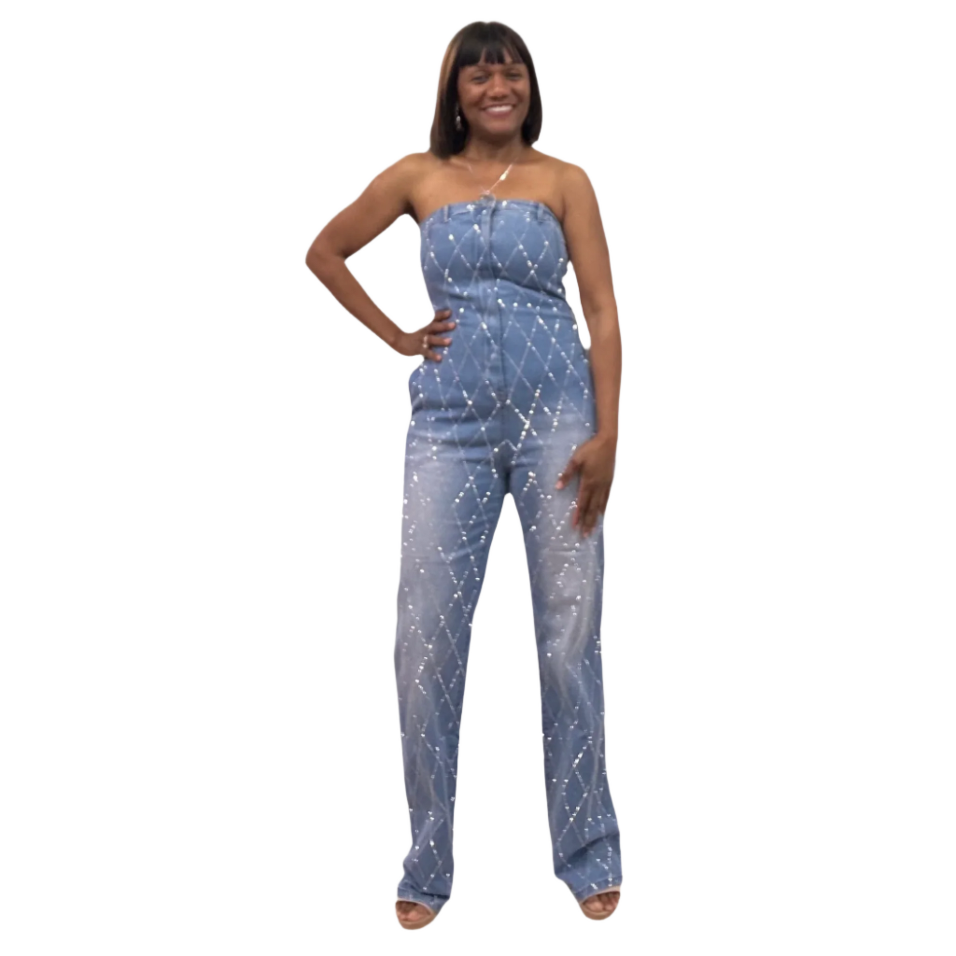 Denim Rhinestone Halter Jumpsuit. 75% Cotton, 23% polyester 2% Spandex