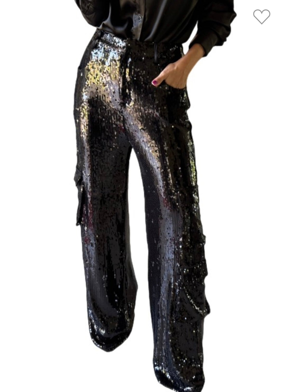 Sequin cargo pants that Can be dressed up or down with some sparkly shoes. 100% polyester.