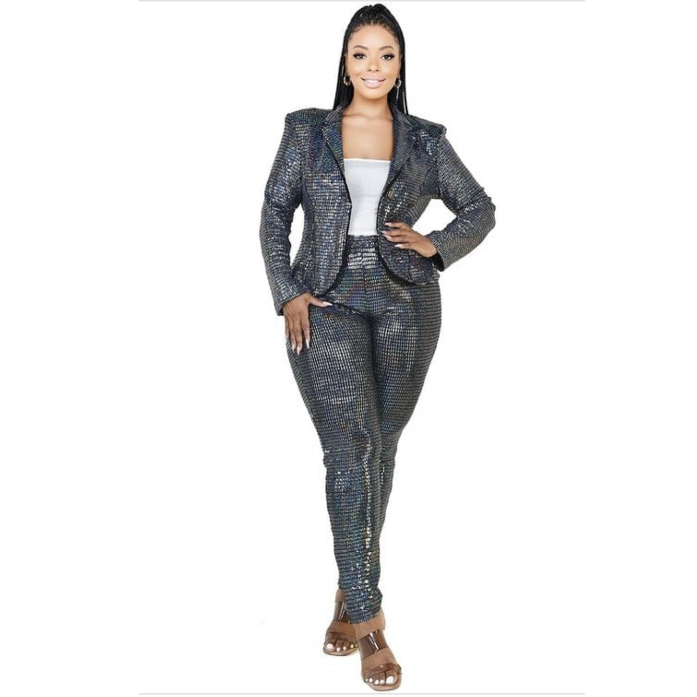 SEQUIN 2 PEICE SET-ONE BUTTON -PADDED SHOULDER -ELASTIC WAIST BAND -STRETCH