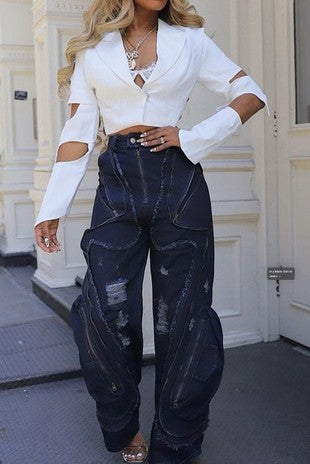 Cargo Jeans with large pockets at bottom leg, array of zippers and denim details makes these Jeans unique and appealing. 100% Cotton. Very good quality material.