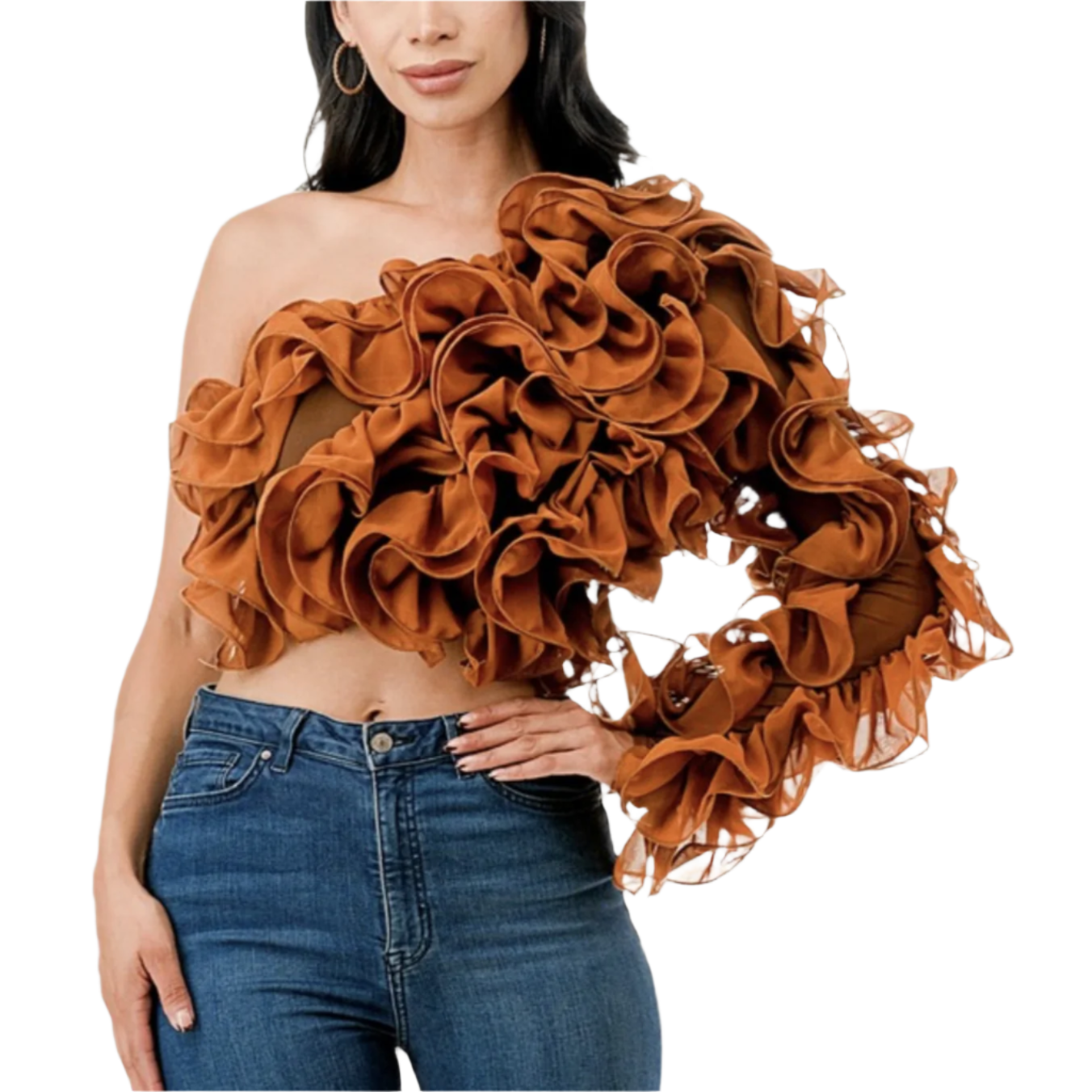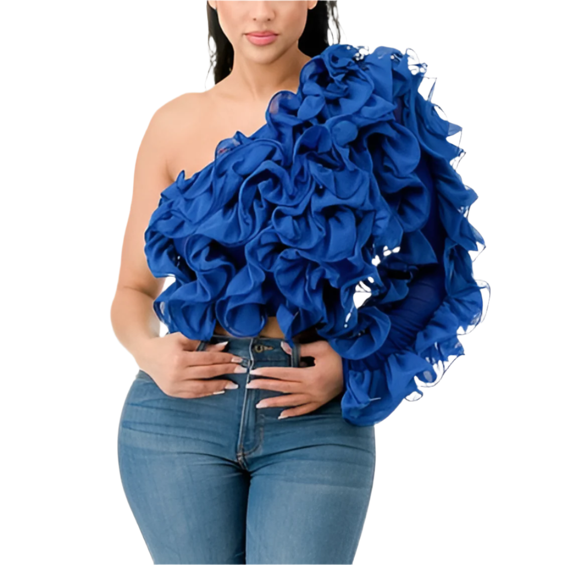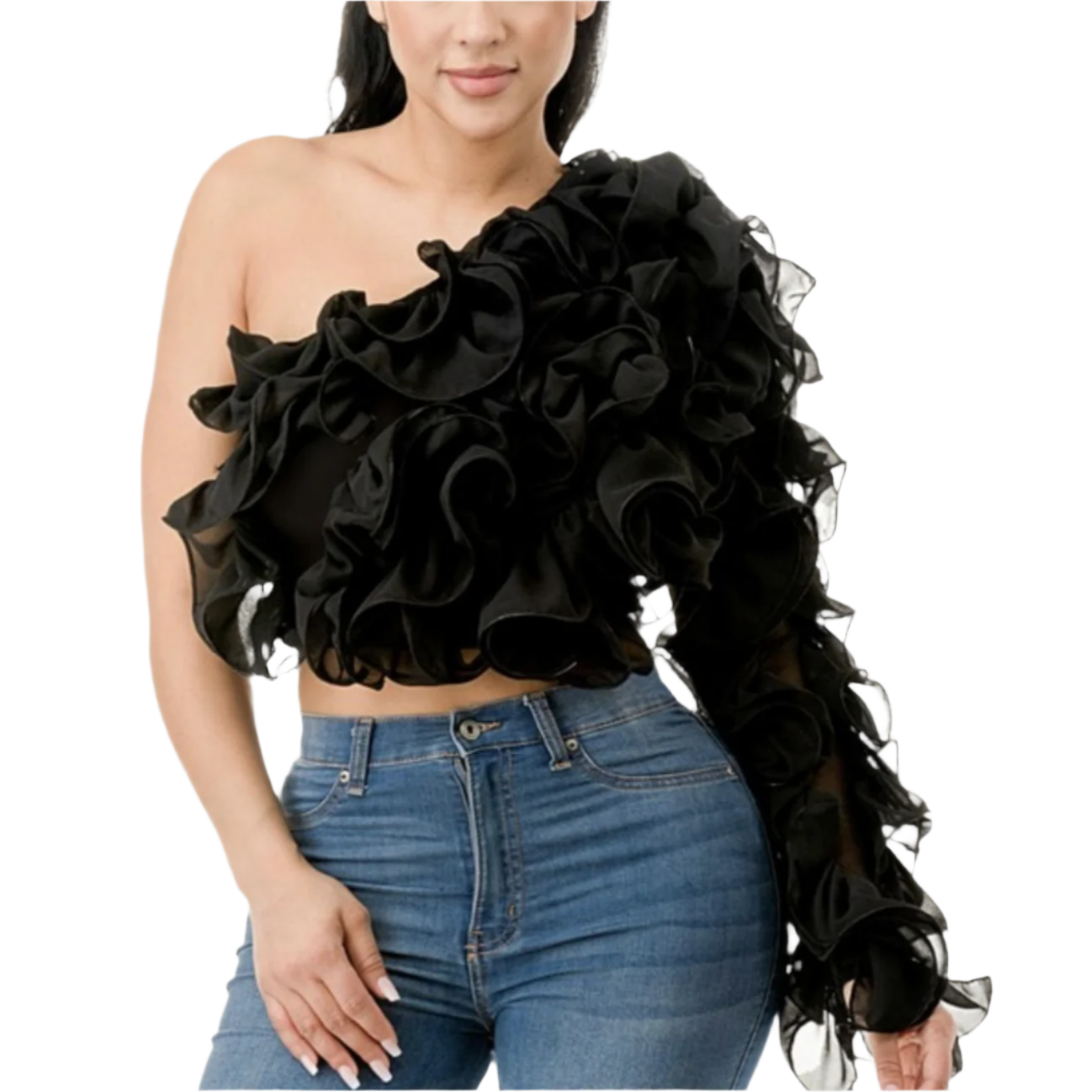 Lots of layers, one sleeve blouse. 100% Polyester. very good stretch.